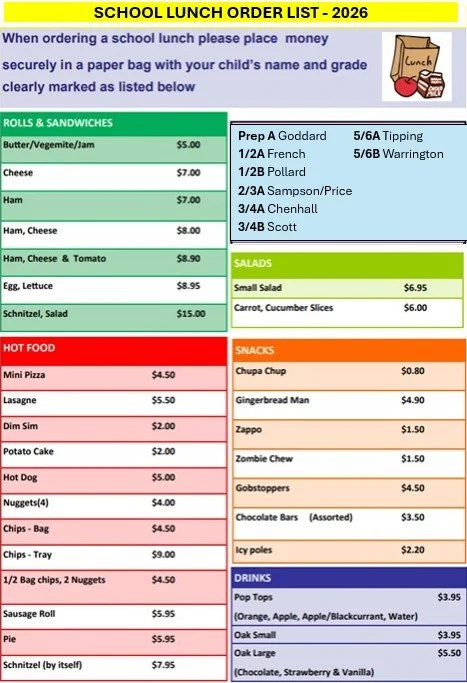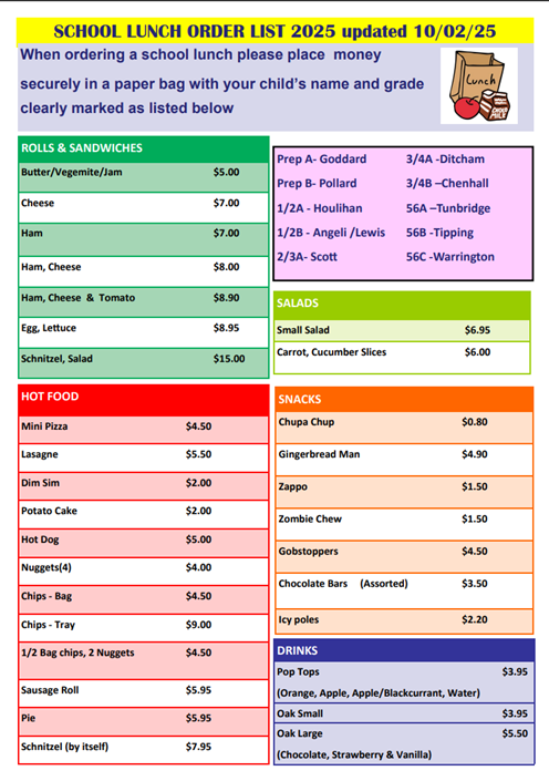 Lunches can be ordered each day. Please send a paper bag to school with your child’s name and grade clearly marked. Correct change is preferred.
